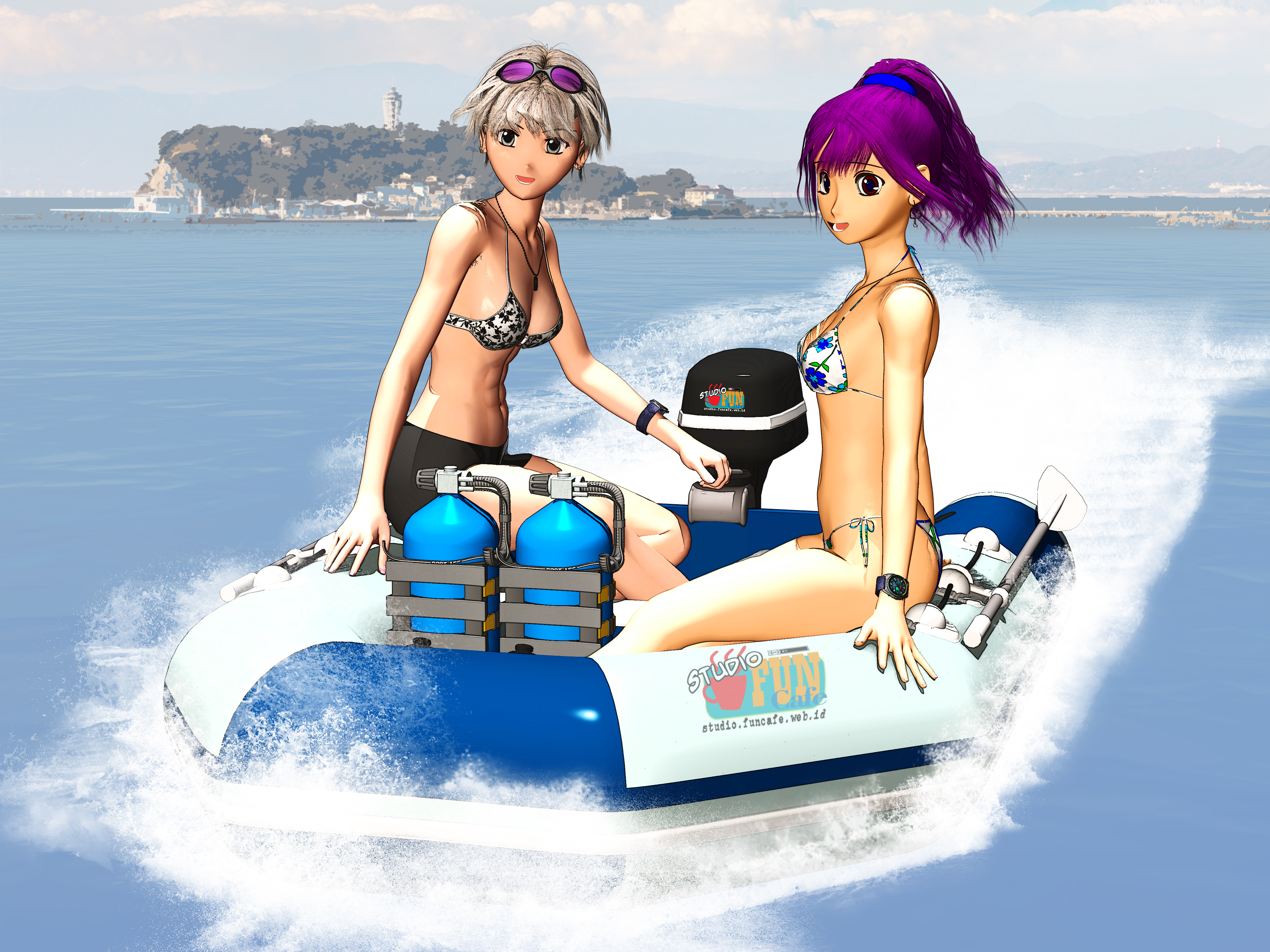 Dinghy is a small boat that usually attached to a larger boat or shore-based installation. The usual purpose of a dinghy is to ferry people from shore to vessel or vice versa, but it can also be used for other purpose. A dinghy has many variant, from a rigid wooden vessel to an inflatable rubber boat. It also has many forms of powerplant like oars, sail, and motor. Today, our girls are using a motorized inflatable dinghy to stroll around the bay looking for perfect diving spot. While this boat can run fast due to the power of the motor, it's not efficient at high speed due to the hull shape. On the positive side, this boat is very stable while stationary due to its buoyancy, so it's a perfect platform for diving activities.