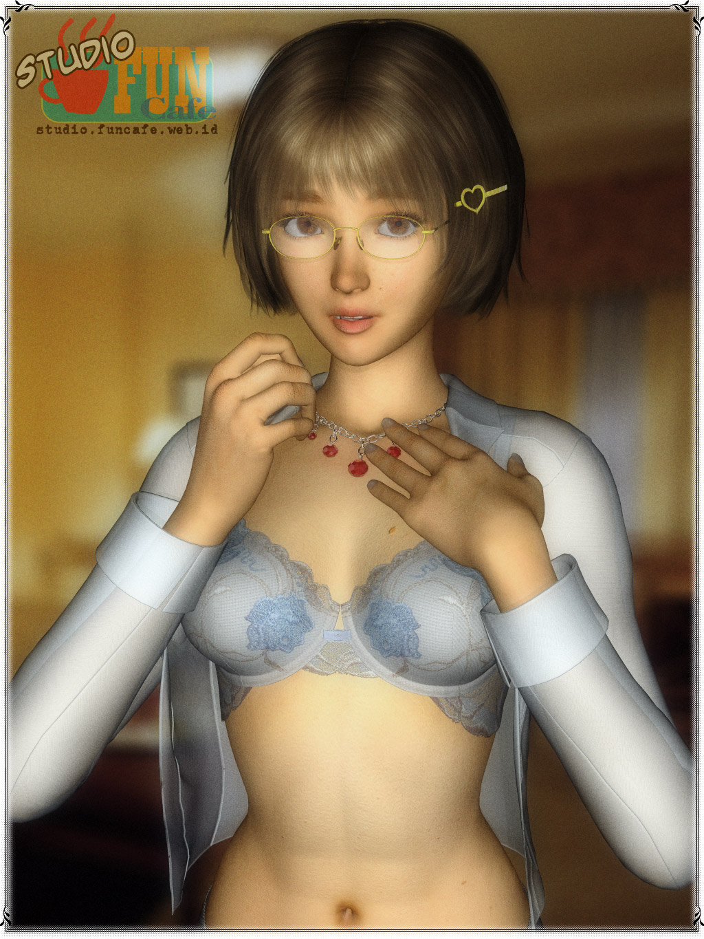 The title means: cute glasses girl. At first when I put the glasses on her, I wanted to make an image of a smart & intelligent girl, but suprisingly the result was far from the planned. She appears more cute than smart with that glasses, looks like a schoolgirl. Don't be fooled, she's older that her appearance (I might get into toruble when she looks younger and younger each time I render her)