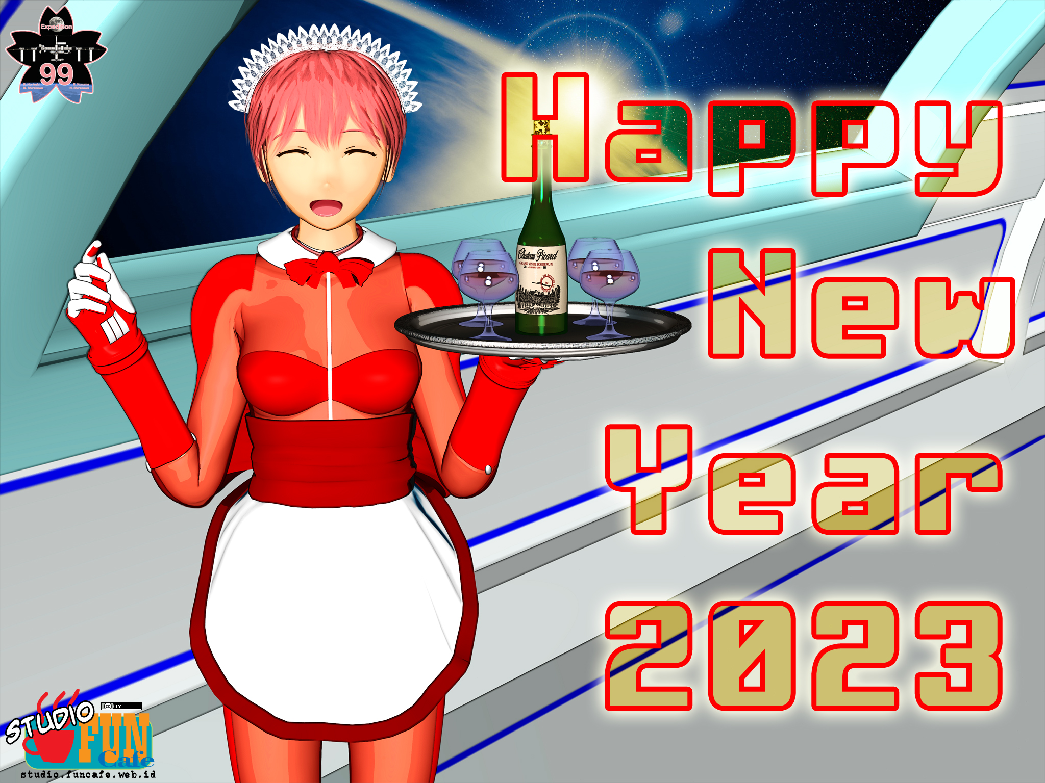 | Title: New Year 2023 Finished: Desember 30, 2022 The 2023 New Year greeting card. The theme is a maid astronaut on future space station where artificial gravity exists. |