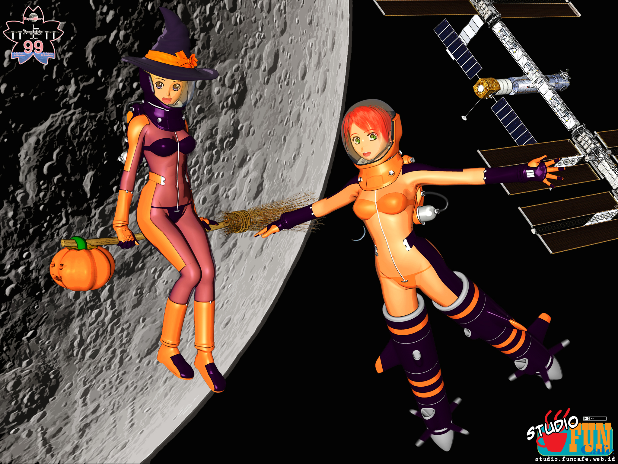 | Title: Space Witches Finished: October 31, 2023 This was made for Halloween. Our girls cosplaying as witch while doing spacewalk. The broom sent on previous scene turned out to be a magical broom that can float in space. There're also modern version of broom (taken from another famous anime series, I think you know what anime it is) delivered that can be used as a space thruster. Usually, Halloween feel looks more dramatic under the full moon. So, to get a full moon effect, our girls performed the flight in the moon orbit where you can have the whole moon to gaze. |